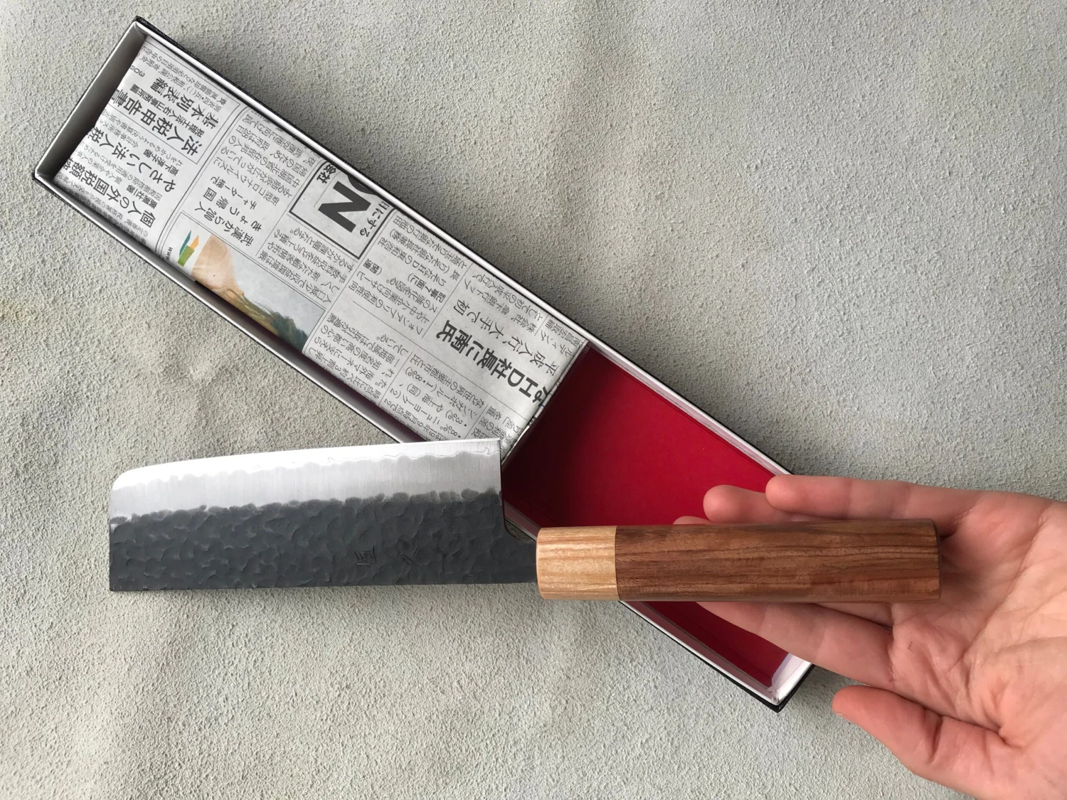 The handle (traditional Japanese Wa) is oval and smooth, with no discernible transition between the walnut and maple wood. It’s suitable for both left- and right-handed users.