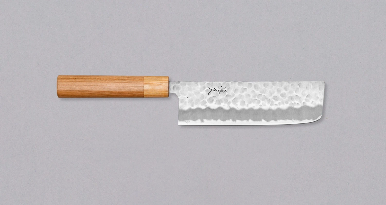 The Tsunehisa Nakiri Shirogami #2 Cherry 165mm (6.5″) is a great vegetable focused knife with a beautiful cherry wood handle and hammered dents. Nakiri is a double bevel version of the traditional Japanese knife Usuba (which are traditionally single ground). These knives are made for one task only – cutting vegetables.