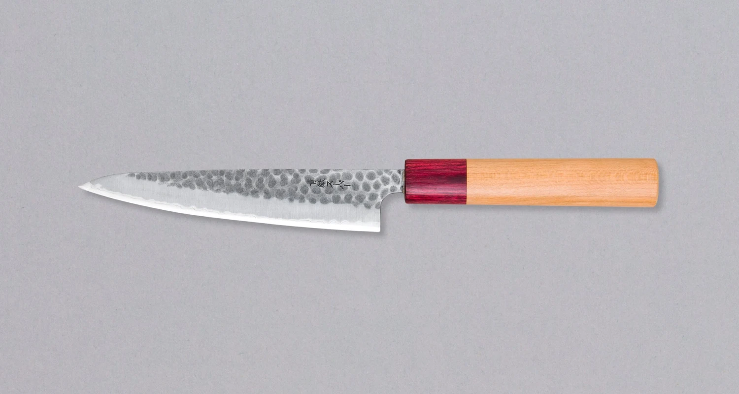 Tsunehisa Petty Aogami Super Cherry 135mm (5.3″) is a multi-purpose knife with hammer dents and a beautiful cherry wood handle. The shape of the blade will suit anyone looking to complete their collection with a smaller knife, perfect for more delicate and freehand tasks where a larger (and wider) knife would perhaps prove too unwieldy. Due to the choice of steel, the blade is also very easy to sharpen.