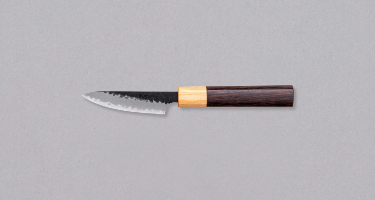Tsunehisa Petty Kuro-uchi 80mm [Rosewood] is basically a smaller version of a gyuto knife (Chef’s knife). Petty knives are intended for all those smaller tasks where larger knives are deemed unwieldy, both on and off the cutting board. A must-have knife in every kitchen, it can be used for peeling, mincing, paring and decorating food.