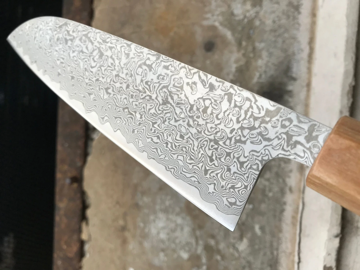 This extraordinary and uncommon Damascus pattern is made by various techniques, including drilling into the steel to get these circular shapes. Every piece has a unique pattern, making every knife a one-of-a-kind. The handle has an octagonal shape and is made of rosewood with a maple ferrule. It can also be used if you are left-handed.