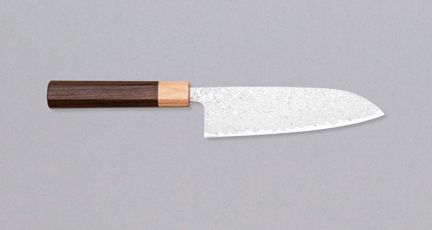 This santoku is manufactured at the smithy of Tsunehisa in Tosa, Japan.