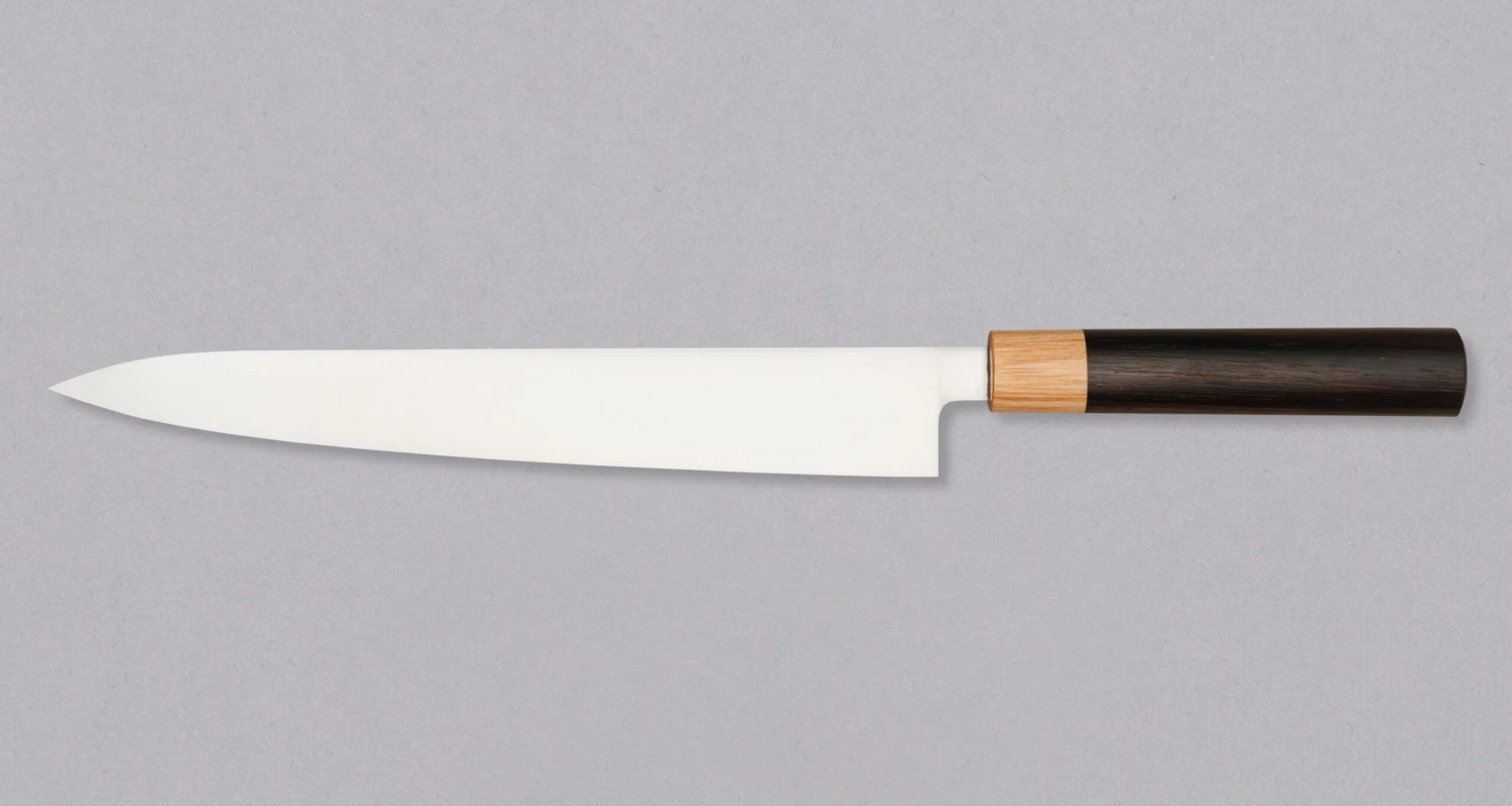A Slicer (jap. Sujihiki) is a knife with a long and narrow blade, especially designed to cut thin slices of meat. It is also used for many kitchen jobs, where precision is of paramount importance. Suitable for all cooking enthusiasts and professional chefs. This is a knife that was missing in the knife bag of all you sushi masters and steak eaters out there!Â