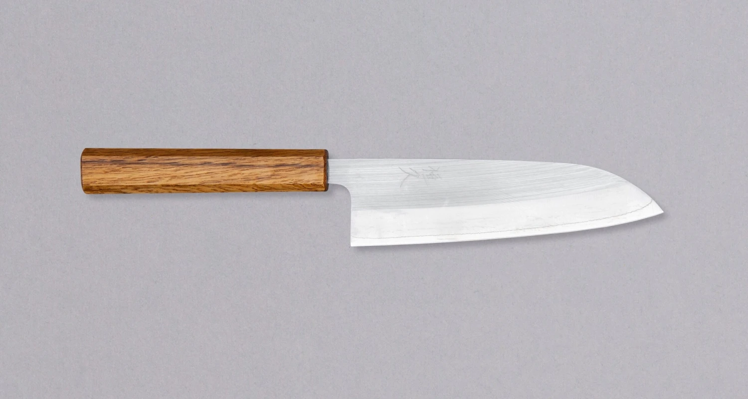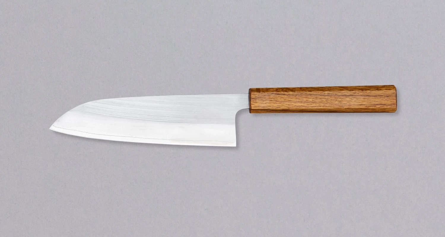 The blade is minimalistically polished in a Japanese »hair–line« design, attached to a simple yet resilient traditional Japanese Wa oak handle. A very thin blade followed by an even thinner concave grind places this santoku in the lightweight mid-size Japanese multi-purpose category.