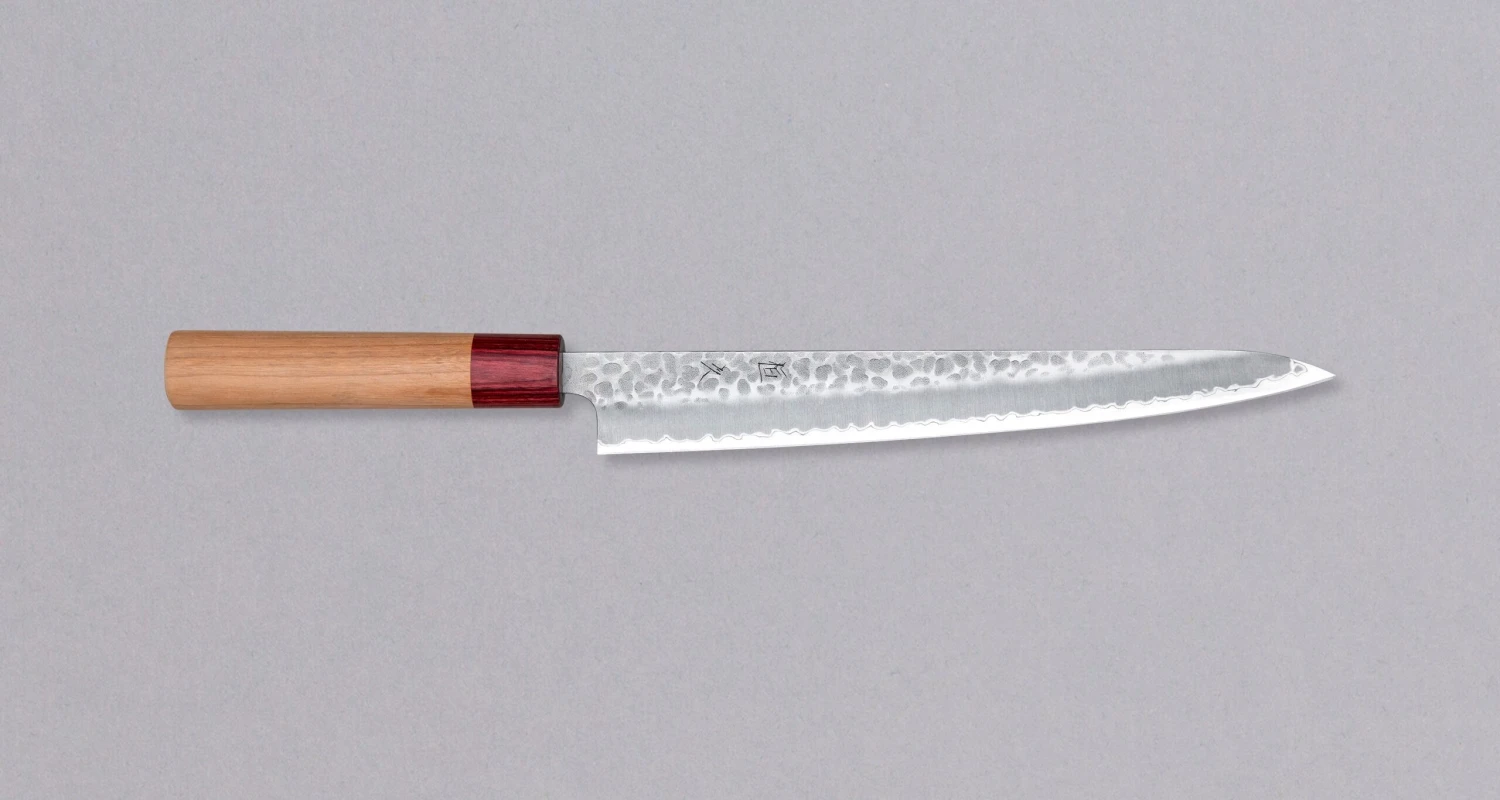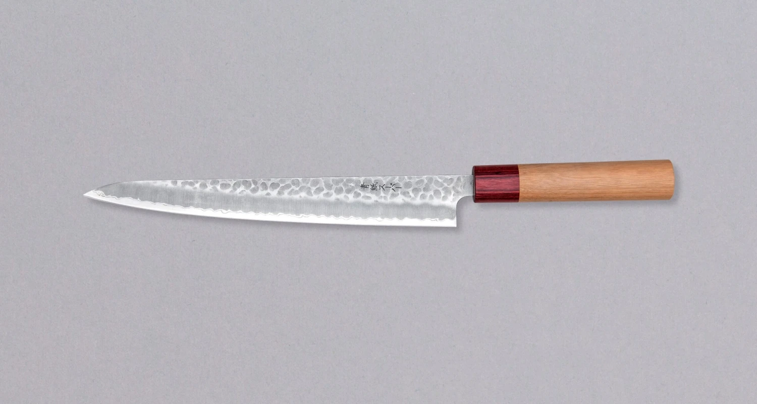 The Tsunehisa Sujihiki Aogami Super 240mm (9.5″) is a hand-forged knife with hammer dents and a beautiful cherry wood handle. Its long and narrow blade is intended for long pulls and precise cuts, making it perfect for slicing meat or boneless fish, and also for filleting and skinning fish. Due to the choice of steel, the blade is also very easy to sharpen.
