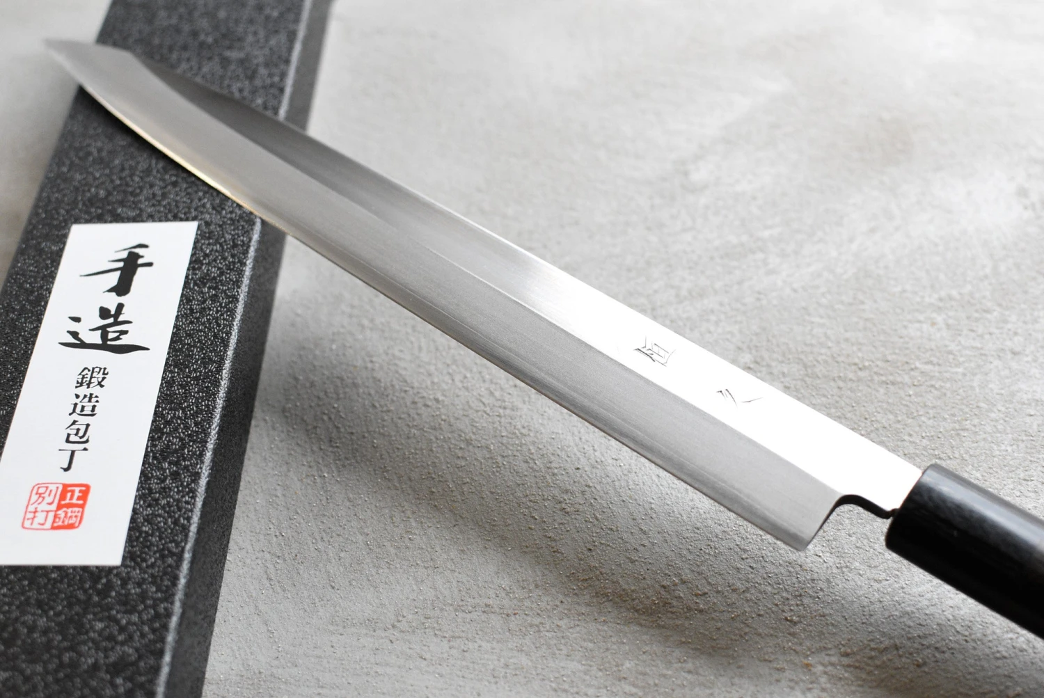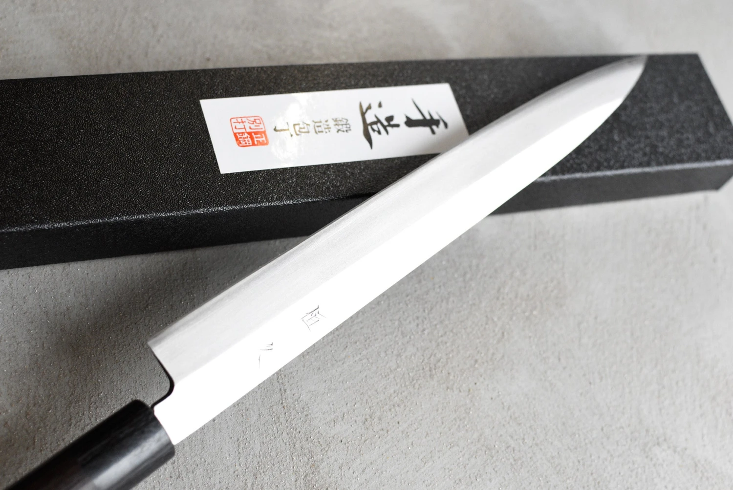 Due to the choice of materials and precise final treatment of the blade by hand, the blade is simple to maintain, retains its edge for a very long time and is perfect for sharpening on water stones. These are essential characteristics of a traditional Japanese single bevel knife, such as Yanagiba.Ā