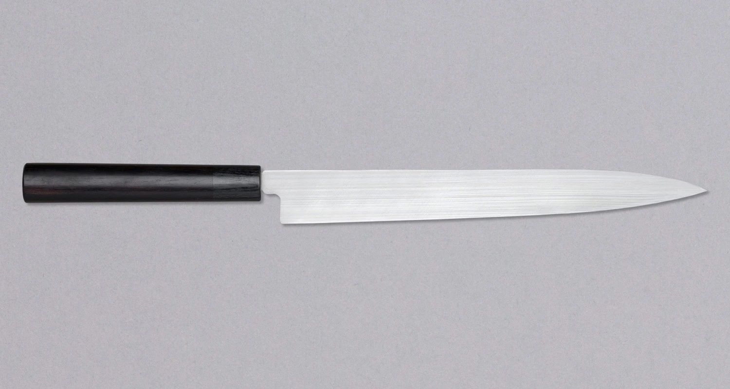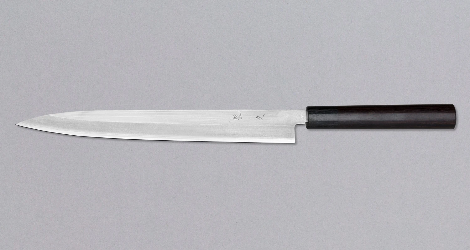 Yanagiba is a traditional Japanese knife. Due to its long and thin blade it is mainly used for cutting thin slices of raw fish (ideal for sushi lovers),Ā and also for cutting large pieces of meat (eg steaks).Ā It is one of the “holy trinity” of Japanese classic kitchen knives for sushi preparation. The length of this single beveled bladeĀ (LEFT-HANDED USERS ONLY!)Ā is 270mm (10.6″).