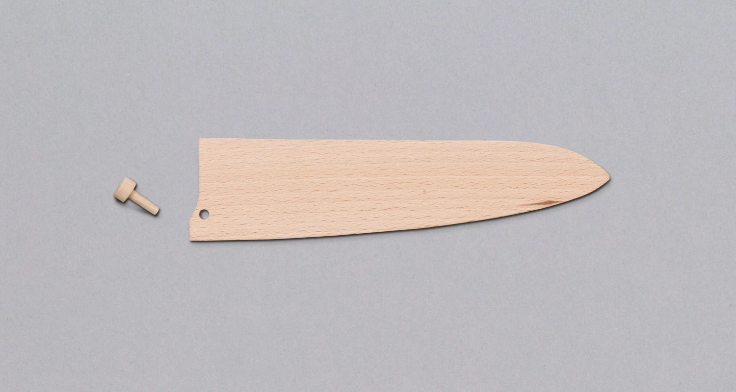 Saya, a wooden knife sheath protects the knife and its user from damages and injuries. It also keeps the knife sharp and makes it easier to carry around. Its wooden safety pin prevents the knife from falling out. Saya is made of beech wood, a firm yet still soft enough wood, making it more durable and resistant than any leather sheath.