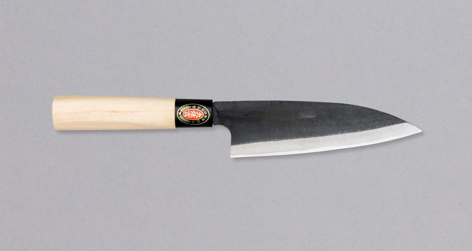Yoshida Kuro-uchi series knives are traditional Japanese rustic knives. Its price is very affordable for the quality of a hand-forged knife. It is suitable for the first purchase of a traditional Japanese knife. The blade is forged in SUJ-2 steel, which offers incredible capacities, hardness is 63-64 HRC, and at the same time the knife is very easy to resharpen. The blade needs some extra care. After the use rinse it well and dry it.