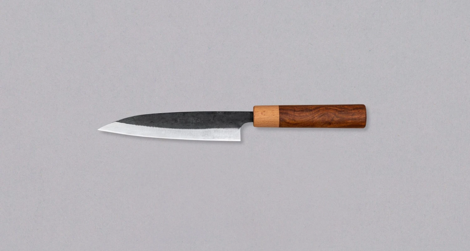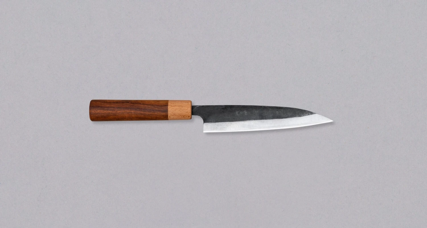 The Kuro-uchi Utility is a medium-sized kitchen knife suitable for all types of cutting tasks. This knife is so versatile that it can be used both as a main multi-purpose knife, as well as a knife for smaller tasks. Kuro-uchi knives are traditional Japanese knives made by the Yoshida Hamono smithy in southern Japan. The name Kuro-uchi refers to the appearance of the blade, which is raw on top and has already developed a dark patina that protects the blade. Because of their traditional look, hard steel, and incredible performance, they are ideal for first-time buyers of carbon steel Japanese knives.