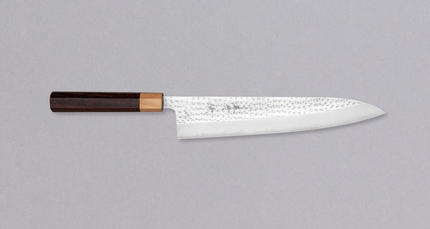Kurosaki Gyuto from the Senko line is another uniquely looking blade from the hands of a talented master blacksmith Yu Kurosaki. The unique hammer imprints on the top part of the blade resemble a dazzling diamond pattern − hence the name SENKO. The blade has a high polish finish.