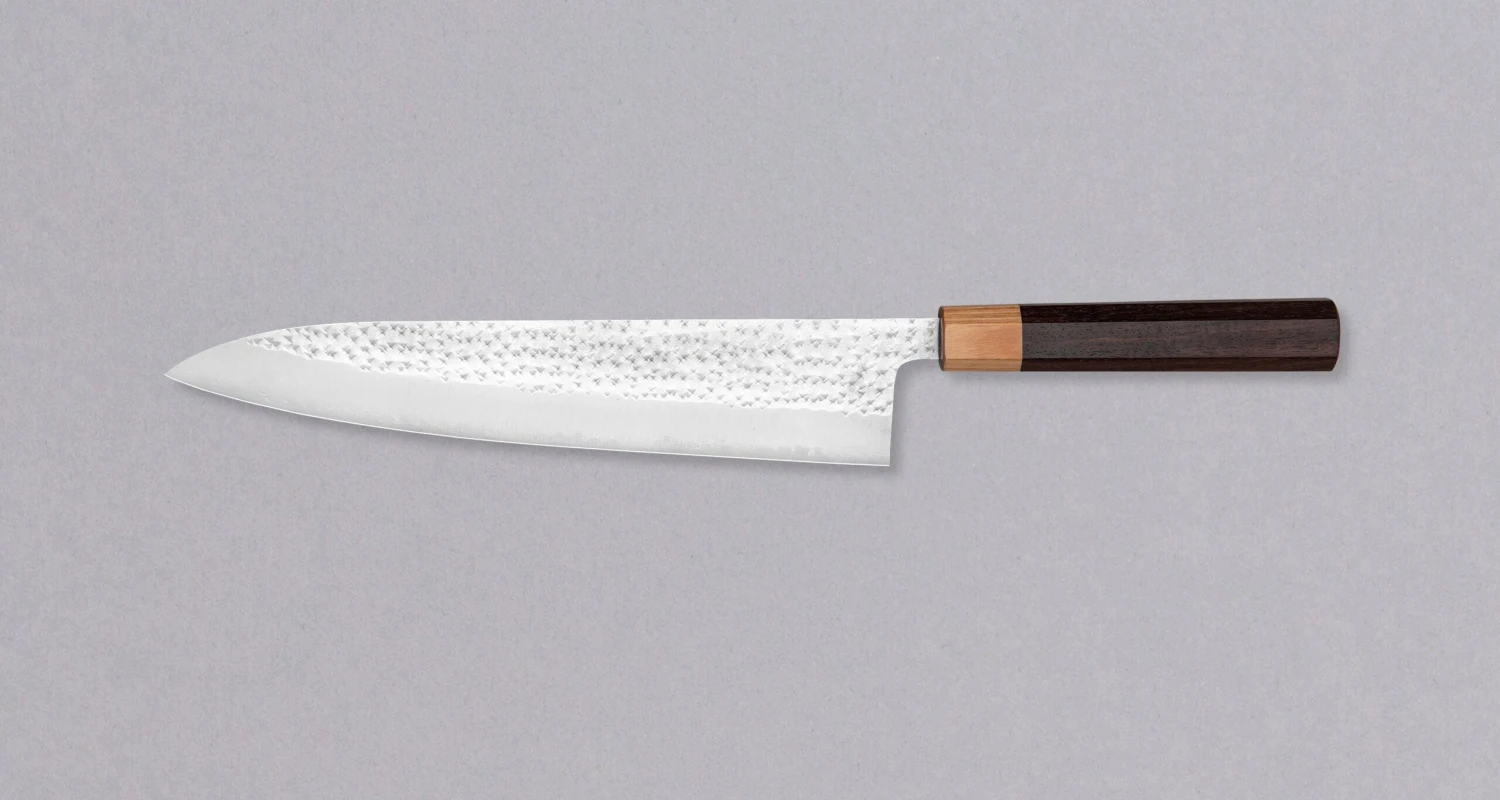 Yu Kurosaki is a talented master blacksmith who lives in Takefu Knife Village, close to the city of Echizen. His knives are well known throughout Japan and also around the world for their beautiful, unique-looking design and superior quality. Hammer’s dents on the blade are his signature finish, and just like with snowflakes, not a single dent is alike. Needless to say (but we will say it anyway), his knives don’t only look great but they’re also made of high-quality steel and have a razor sharp, long-lasting edge.