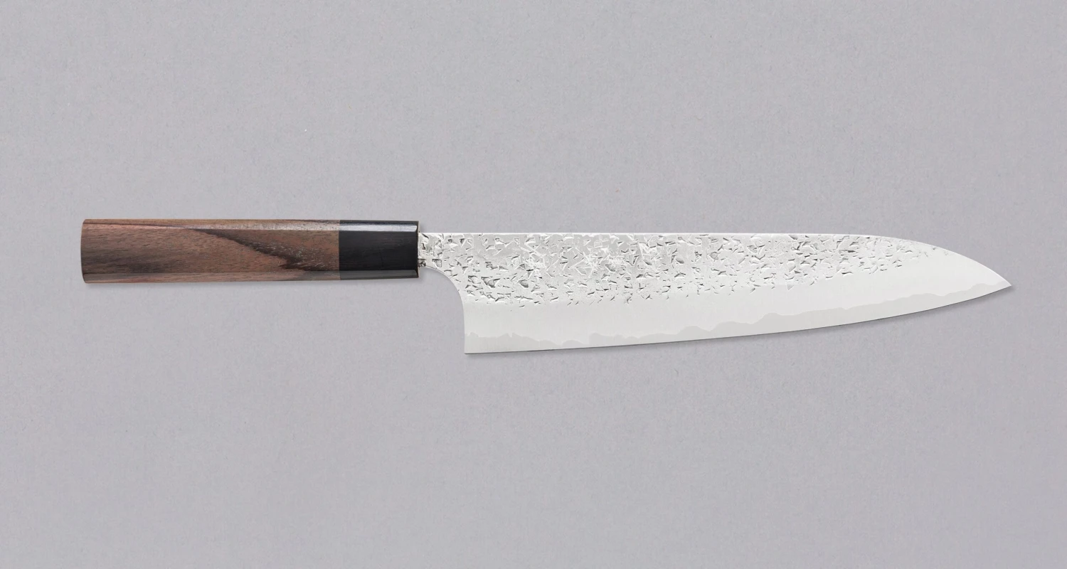 Kurosaki Gyuto from Shizuku line is another uniquely looking blade from the hands of talented master blacksmith Yu Kurosaki. The unique hammer imprints on the top part of the blade resemble water droplets – hence the name Shizuku. The blade is treated to a high polish.
