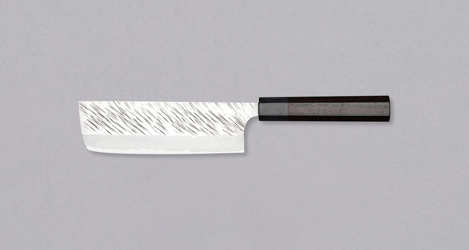 The Nakiri blade, a traditional Japanese knife shape, is specifically designed for cutting vegetables. Its flat edge and squared-off tip allow for efficient chopping and slicing, making it a preferred choice for prep cooks who handle a substantial volume of vegetables daily. The blade’s straight edge provides optimal and stable contact with the cutting board and allows for fluid movement, providing the user with enhanced control and maneuverability. If you find yourself facing a mountain of veggies to prep, the Nakiri blade is a total game changer!