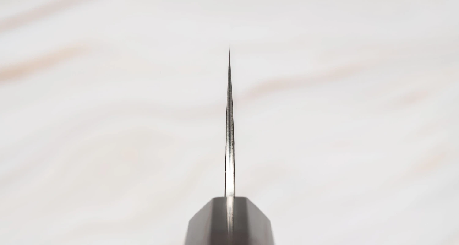 It has a double bevel (50/50 symmetrical) blade with a flat v-edge grind. The blade has a distal taper – at the tang, the blade is 2.4mm (0.09″) thick and narrows towards the tip, where it is 1.8mm (0.07″) thick. This gives it more strength and weight at the handle (meaning we can exert more pressure with the heel) and more precision at the tip, allowing for smooth and precise cuts.