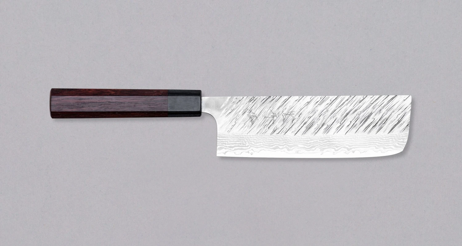 Kurosaki Nakiri Fujin is a uniquely looking blade from a talented master blacksmith Yu Kurosaki. The knife incorporates well-tested VG-10 steel, which undergoes a heat treatment process to achieve a hardness of 61 HRC. Named after the Japanese God of Wind, Fujin, this Nakiri knife is a powerful reminder of the beauty of nature.