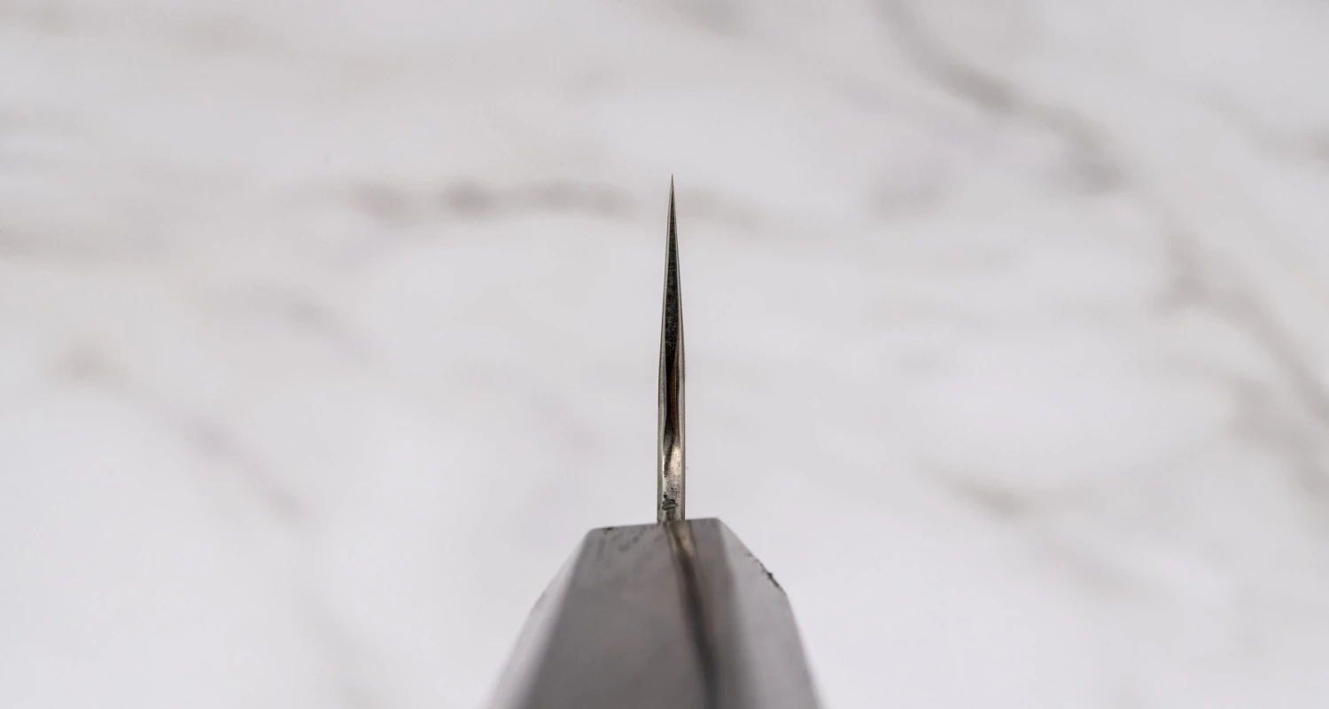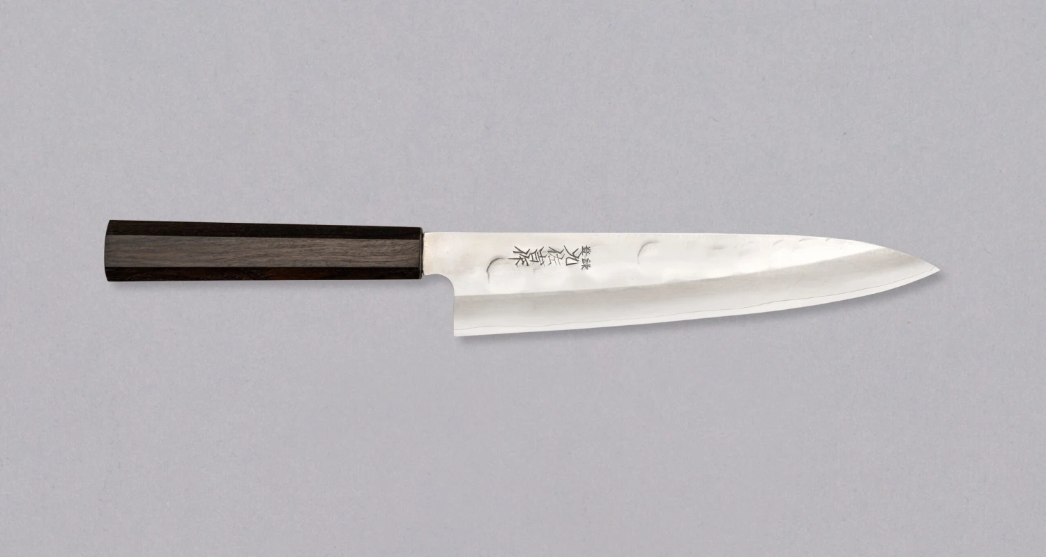 A small batch of ZDP-189 gyuto silver blades from the Yoshida Hamono smithy has been finished with delicate hammer marks, creating a subtle tsuchime finish. With its subtle hammer marks, this knife embodies the Japanese wabi-sabi concept. It celebrates beauty in imperfections, asymmetry, and irregularities, highlighting the uniqueness and authenticity of objects that may not conform to traditional notions of perfection.
