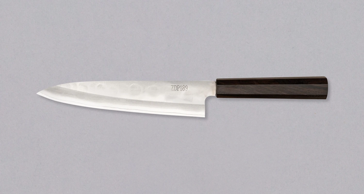Powder steel knives are next level and we have something limited and rare on deck. Introducing the ZDP-189 Gyuto Silver Ebony 210mm (8.3″). This gyuto is made from premium powder steel, ZDP-189, and features a traditional octagonal ebony handle. Limited stock.