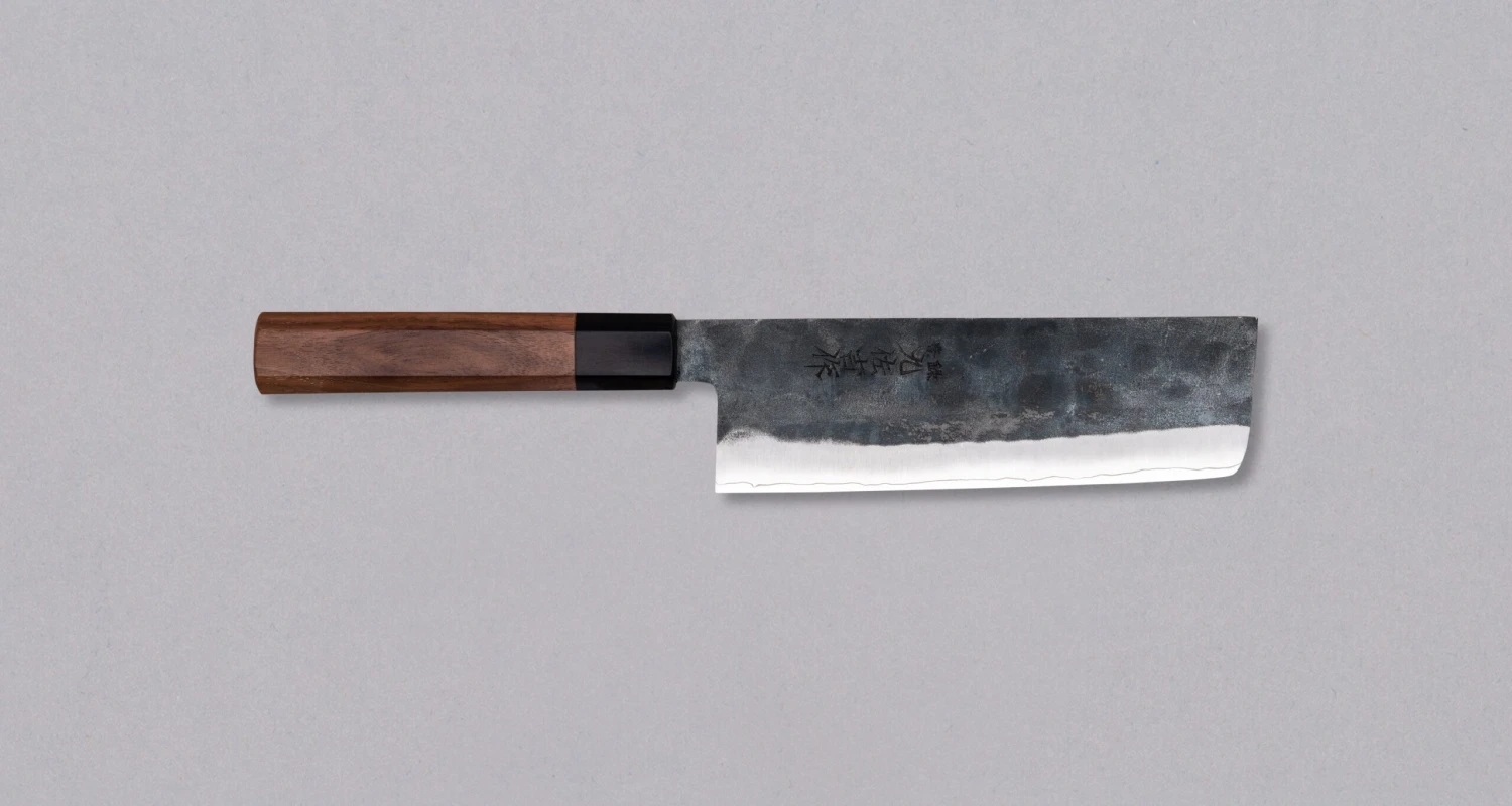 Kuro-uchi finish, the unprocessed (black) part on the top side of the blade has already developed a dark patina, which protects the blade and gives it a traditional Japanese look. The knife bears visible impressions of the hand-forging process (round hammer dents on the blade), which gives it a beautiful finish and also prevents food from sticking to the blade.